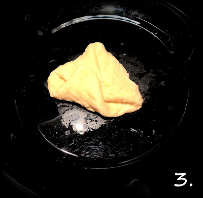 2. Po tym czasie, wyrabiamy ciasto raz jeszcze. Odstawiamy na 5min. Odrywamy z niego kawałki wielkości piłki ping-pongowej i rozpłaszczamy.
